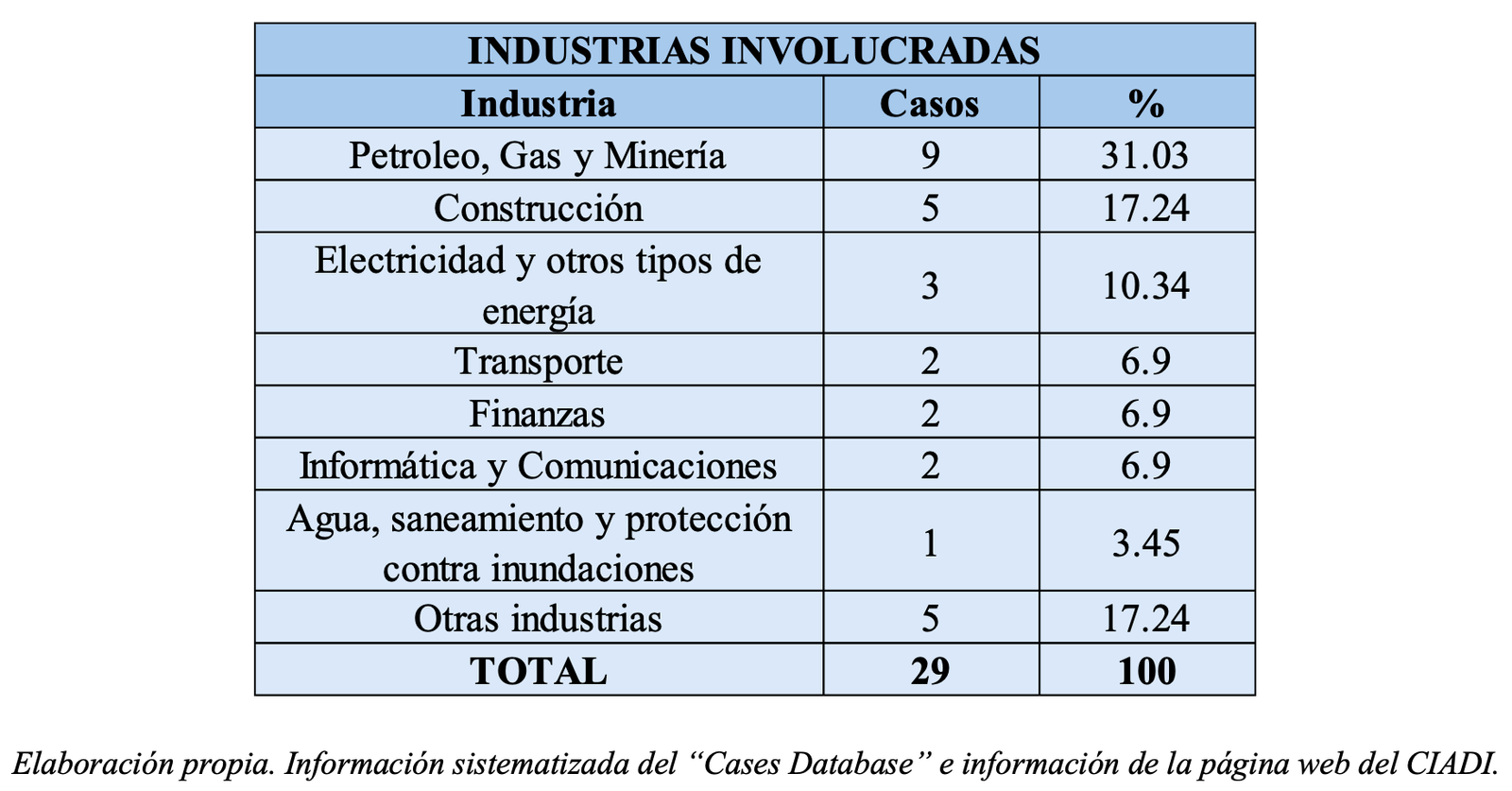 Por otro lado, encontramos que las industrias más litigiosas en Latinoamérica este año fueron las de Petróleo, Gas y Minería (9 casos) y Construcción (5 casos). Los demás (15 casos), se relacionan con sectores económicos diversos. Un resumen de las industrias relacionadas con estos nuevos casos iniciados en Latinoamérica se detalla a continuación: