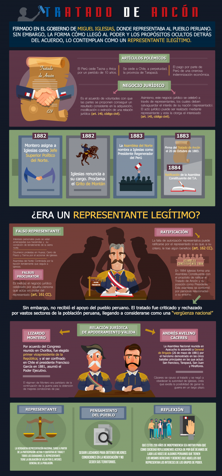 En el periodo de la Guerra del Pacífico, en las últimas décadas del siglo XIX, se celebró el tratado de Ancón, durante el gobierno de Miguel Iglesias. Dicho acuerdo de voluntades tuvo la finalidad de establecer la paz entre Perú y Chile, luego de varios años de conflictos bélicos. En la presente infografía, se analiza este caso histórico a través de la regulación actual del Código Civil, abordando principalmente una de las instituciones del negocio jurídico: la representación.
