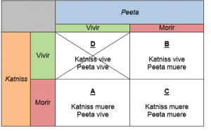 En nuestro ejemplo, podemos observar que Katniss y Peeta eran los prisioneros con únicamente dos opciones racionales en base a la aversión al riesgo y sus capacidades de combate: (i) matar al otro y vivir, o (ii) morir a manos del otro. Pensémoslo sin sentimentalismo por los personajes de por medio. Una Katniss racional en términos económicos tenía la opción de matar a Peeta y conservar su vida (A); a la par, Peeta también tenía en esos mismos términos la opción de matar a Katniss y sobrevivir (B). Esto se corresponde con el efecto que le tocaría a cada uno en caso se efectúe cada uno de dichos escenarios: en (A), Peeta muere a manos de Katniss; mientras que en (B), Katniss muere a manos de Peeta. Otra opción fáctica sería que Katniss y Peeta salgan vivos de la mano del campo de combate (C), opción prohibitiva según las reglas que impuso Seneca Crane en el momento de la escena final: no se permitía que existan dos ganadores.