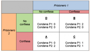 El Dilema del Prisionero es un teorema económico descrito de manera escrita por primera vez[9] por Albert W. Tucker[10], que describe un juego simétrico de dos personas (no de suma cero) con cuatro posibles resultados; el juego consiste en dos prisioneros aislados por el Estado, a cada uno se le dice que si confiesa el crimen tendrá una sentencia de dos (2) años mientras que el otro saldrá libre (A y B), si ambos confiesan el crimen ambos serán castigados con un (1) año de condena cada uno (D) y, finalmente, si ambos no confiesan los dos saldrán libres (C)[11].