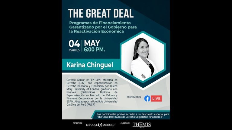 Enfoque Derecho presentó «The Great Deal: Programas de Financiamiento Garantizado por el Gobierno para la Reactivación Económica». Evento en el que Karina Chinguel, gerente senior de EY Law, LLM en Derecho Bancario y Financiero por Queen Mary University of London y abogada por la PUCP, explicó la afiliación de las empresas a los programas de financiamiento a raíz del COVID-19.